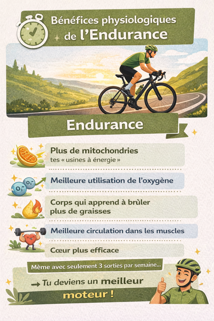 Même si elle paraît “trop facile”, cette zone est le cœur de la progression en cyclisme. Elle provoque des adaptations très puissantes au niveau du corps :